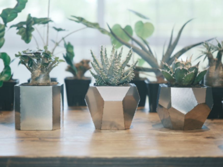 植物好きクリエイターチーム「uell(ウエル)」と、金属加工のプロである梅南鋼材の新規事業「BLUM(ブラム)」が共同開発した、ちょっとユニークな鉢カバーが『metapo(メタポ)』です。ステンレスの板を折り紙のように折り、自分の手で組み立てることで、金属の美しさと温かみを暮らしの中で楽しめます。uellのアイデアとデザイン、BLUMの技術と経験。その強みを掛け合わせることで、「ありそうでなかった」園芸アイテムが生まれました。既製品のプラ鉢にお気に入りの植物を植えて“着せ替え感覚”で楽しめます。気分に合わせて装いを変えることも自由自在。手を動かして“組み立てる”楽しさが、植物を育てるひとときをいっそう愛おしくしてくれます。
