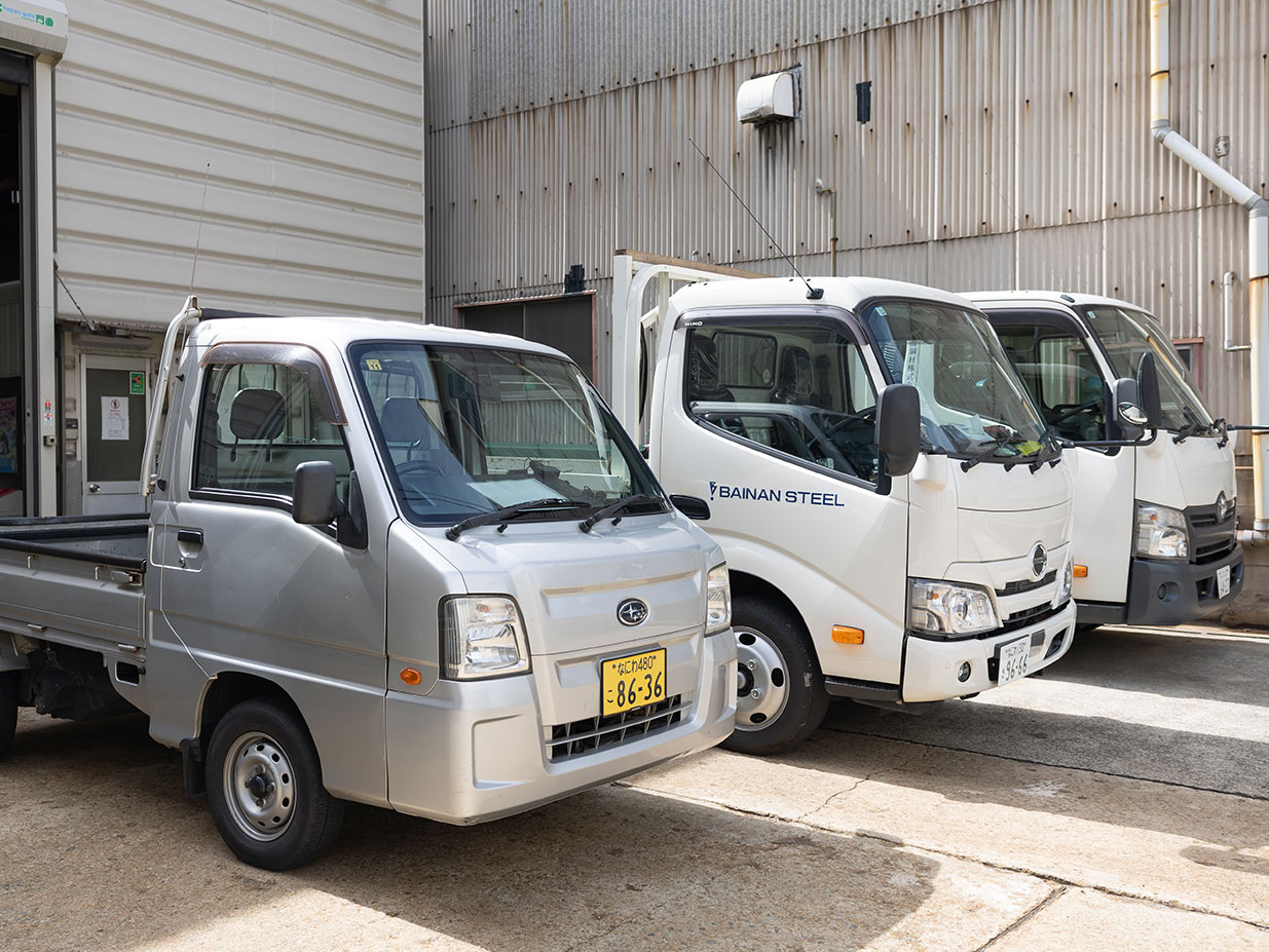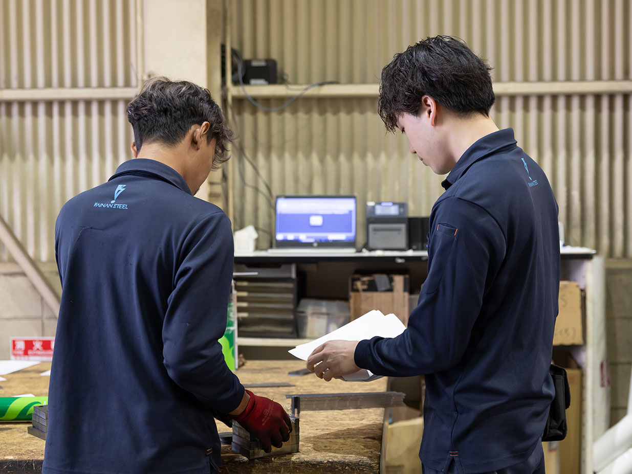 梅南鋼材は、精密切断から曲げ加工、自社配送まで一貫した独自の「プラモデル納品」体系を確立。お客さまの組立工程に合わせた無駄のない分割納品で工程効率化と環境負荷低減を実現しています。少ロットでも最大限の歩留まりで製作し、保管や運搬の手間も削減しています。