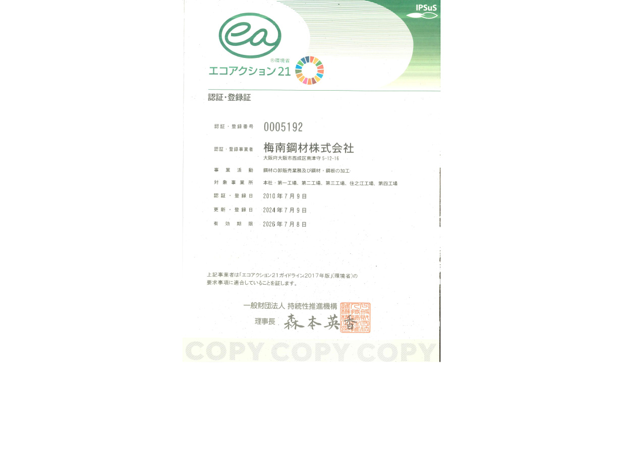 梅南鋼材は、環境省が推進する「エコアクション21」を取得し、企業として環境への配慮と持続可能な社会の実現に向けた取り組みを進めています。事業活動におけるエネルギー使用量の見直しや廃棄物削減、リサイクルの推進など、具体的な行動目標を定め、継続的な改善に努めています。今後も社員一人ひとりが環境意識を持ち、地域社会とともに、地球にやさしい企業活動を続けてまいります。