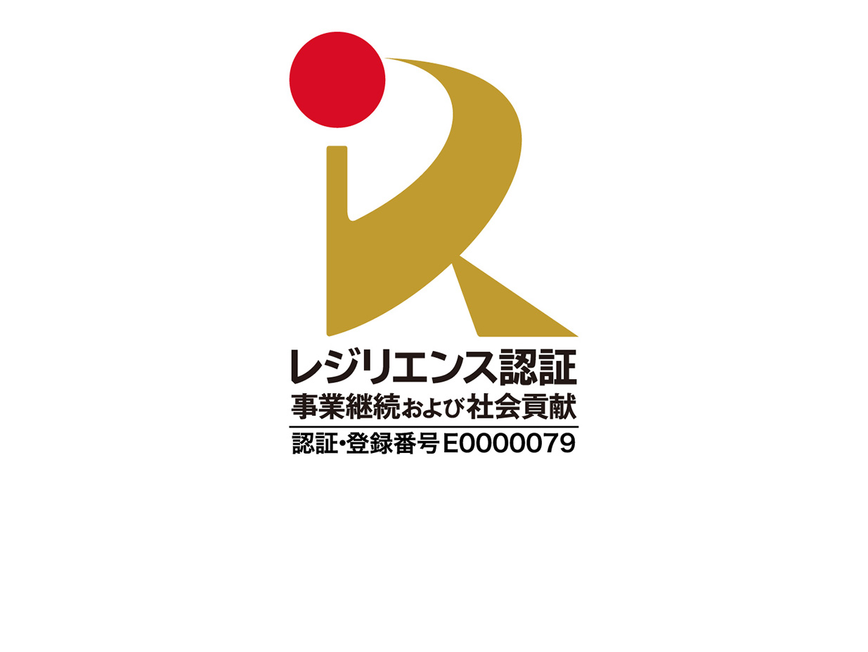 当社は、災害や緊急時にも事業を継続できる体制を整備し、レジリエンス認証(国土強靱化貢献団体認証)を取得しています。レジリエンス認証とは、事業継続計画(BCP)の策定や訓練、体制構築など、リスク管理に関する取り組みが第三者機関により評価されたものです。