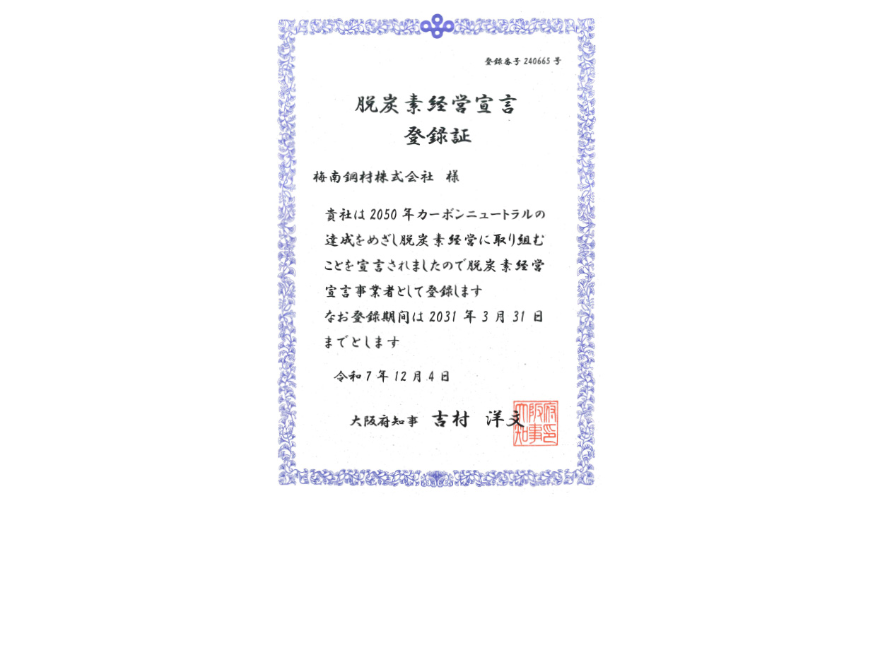 脱炭素経営宣言は大阪府にて2050年カーボンニュートラル達成に向け、脱炭素化の取組みを促進する事業者のための宣言制度です。梅南鋼材はカーボンニュートラルの実現に向けて脱炭素に関する取り組みを続けてまいります。